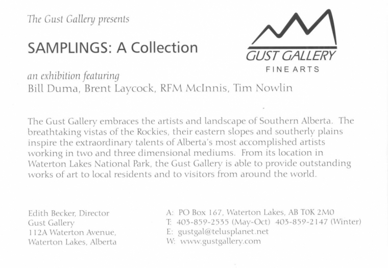 An Exhibition and Sale featuring the work of Bill Duma (painter: Calgary, AB), Martha Henry (sculptor: Calgary, AB), Brent Laycock (painter: Calgary, AB), RFM McInnis (painter: Nanton, AB), Tim Nowlin (painter: Saskatoon, SK), Robert Spaith (bronze sculptor: Longview, AB), Diane Sullivan (ceramist: Calgary, AB)